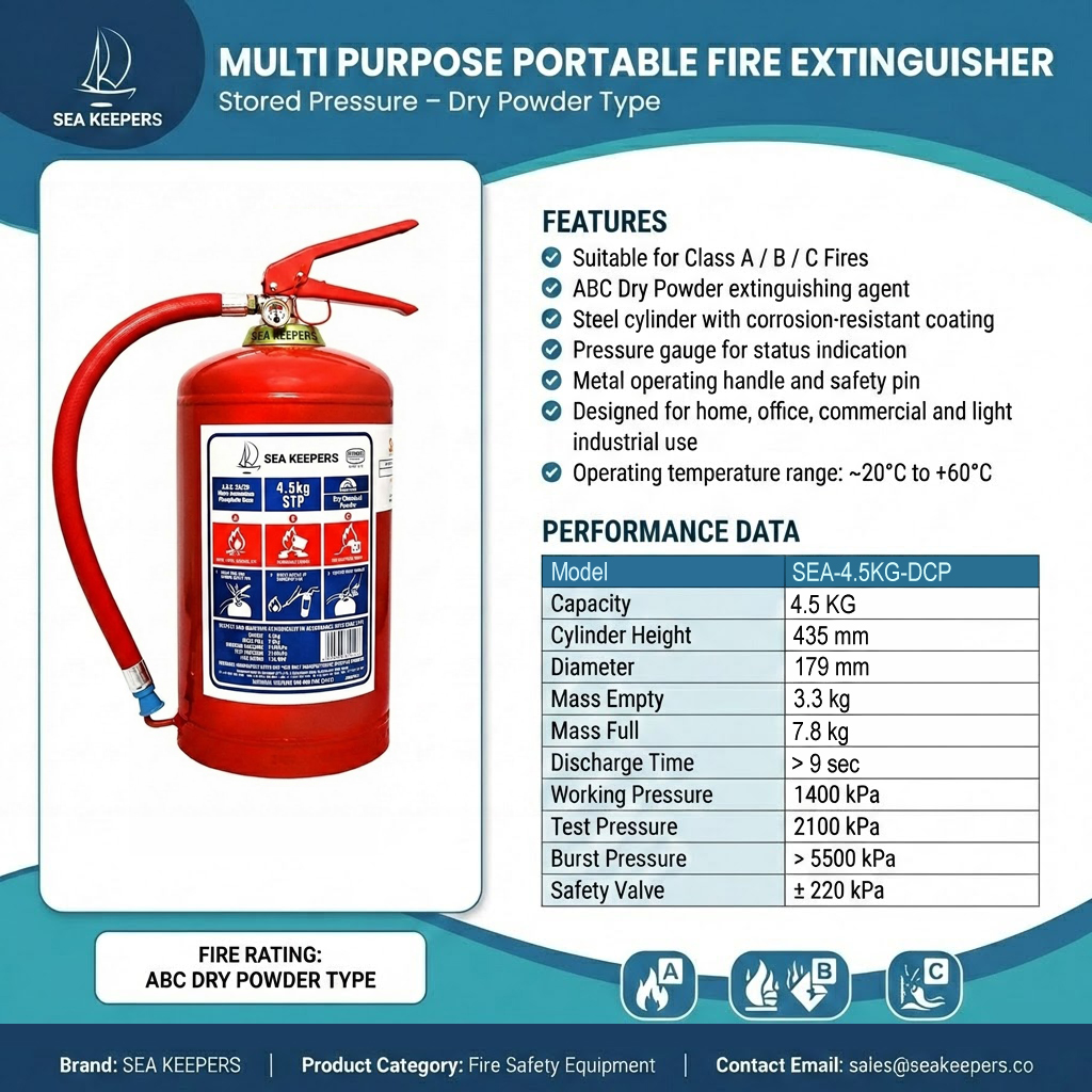 | Product Overview | The 4.5 KG DCP Fire Extinguisher is a high-capacity fire suppression unit designed for rapid response in commercial, industrial, and high-risk environments. It uses ABC Dry Chemical Powder to effectively extinguish fires involving solid materials, flammable liquids, and electrical equipment. |
